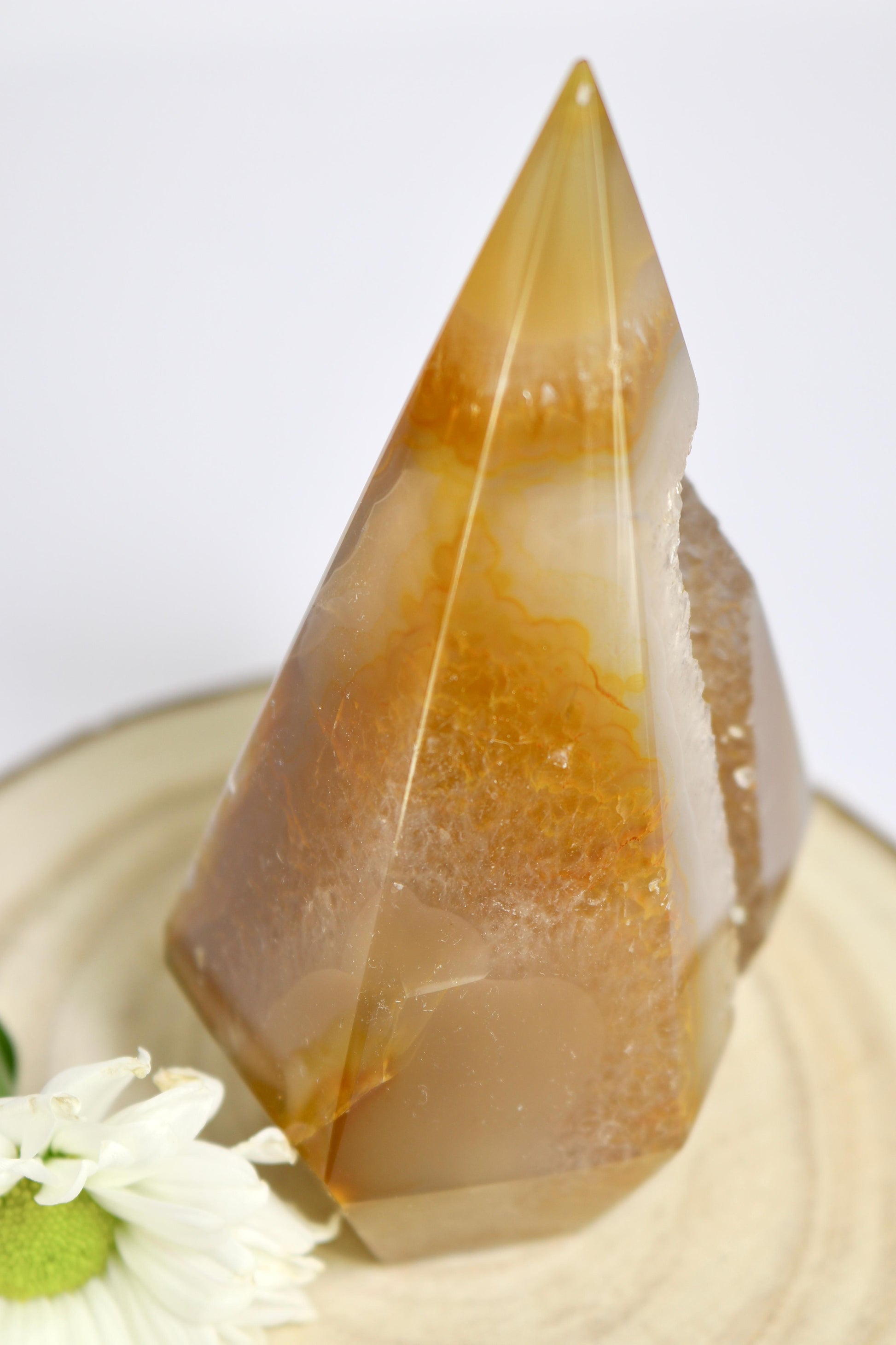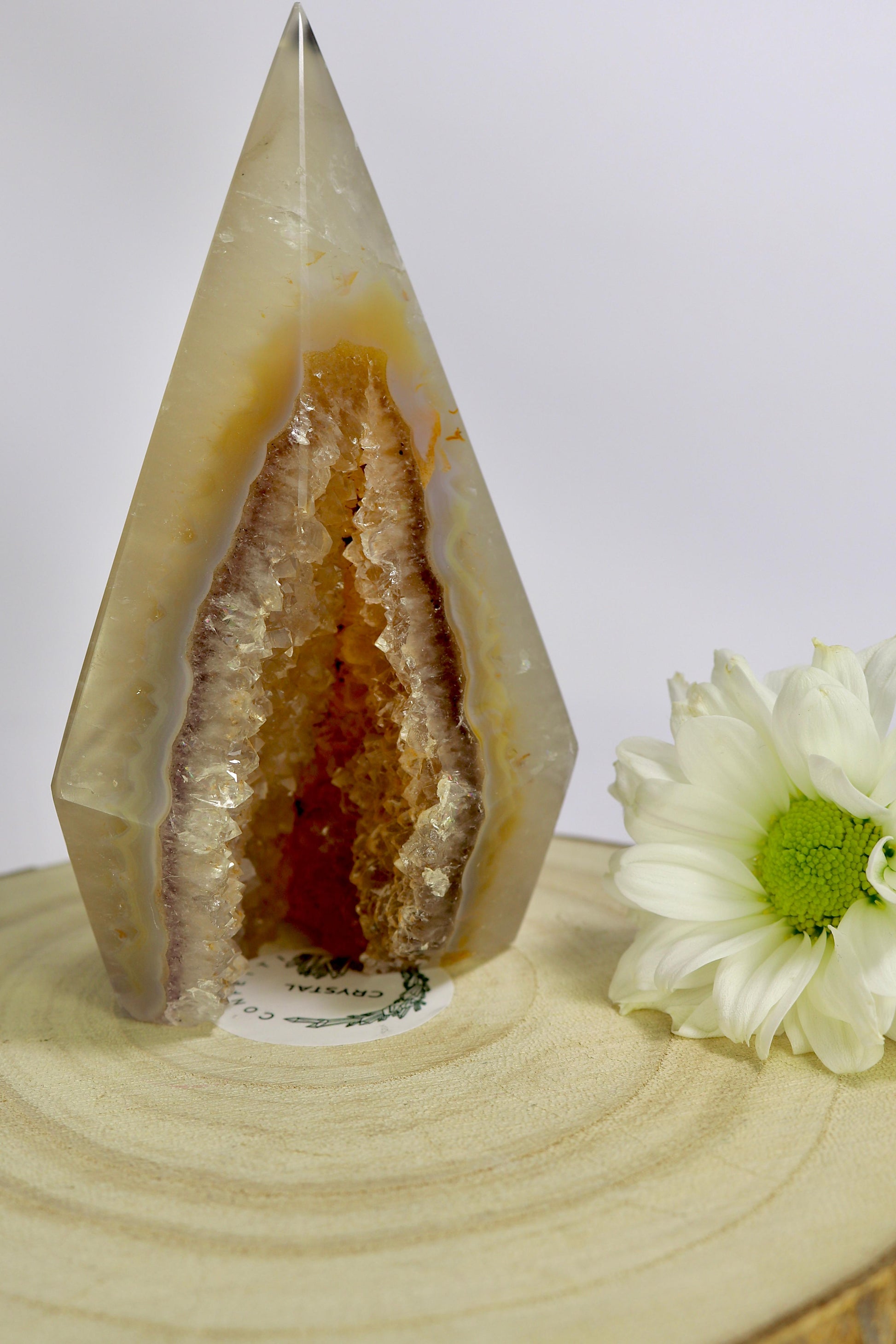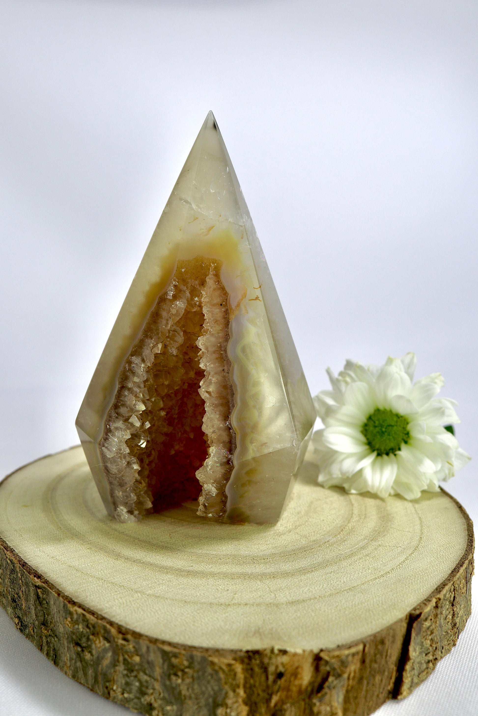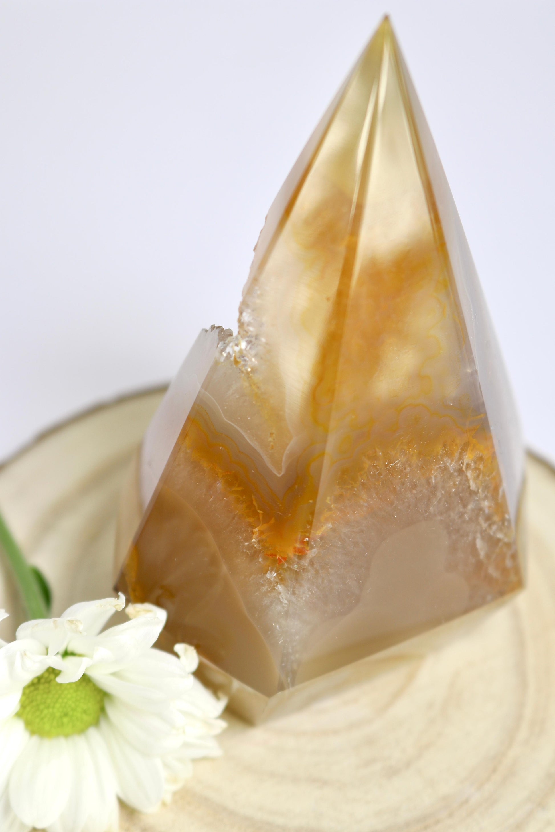 Der Achat-Diamant besticht durch seine markante Form und die natürlichen Farbverläufe des Steins. Er eignet sich ideal als dekoratives Element, Sammlerstück oder besonderes Geschenk.