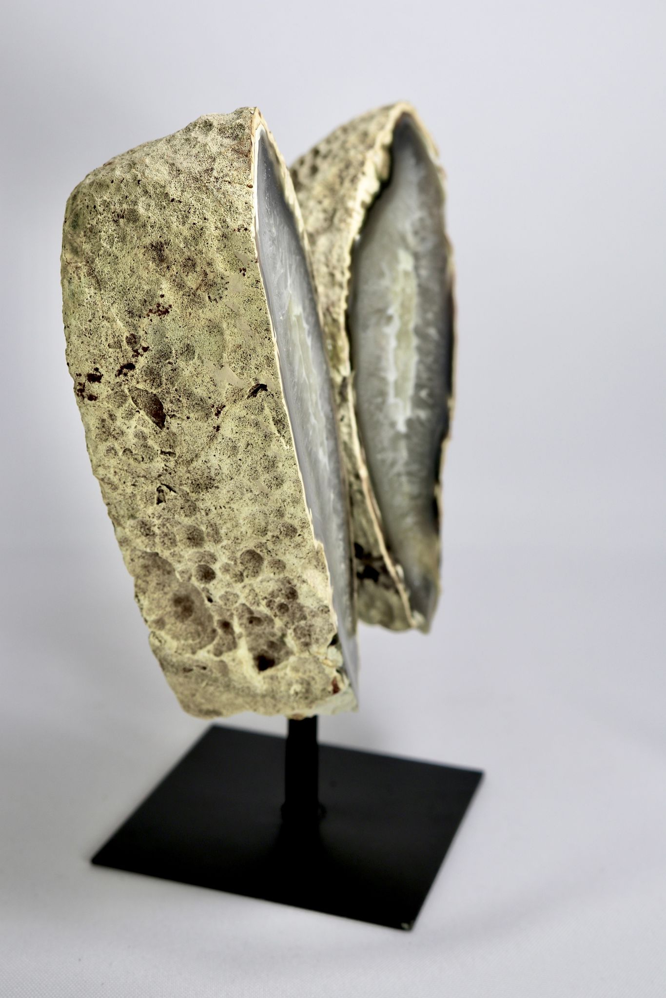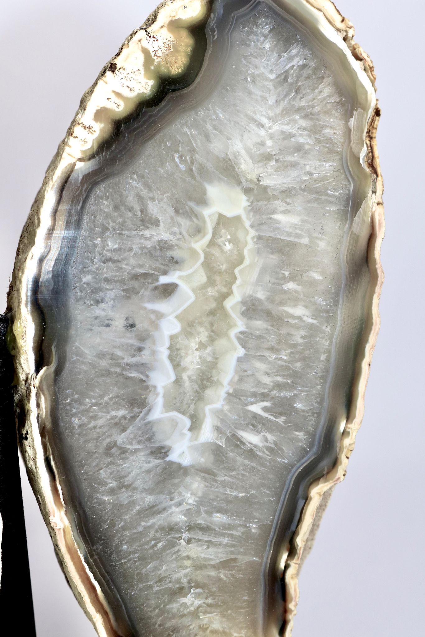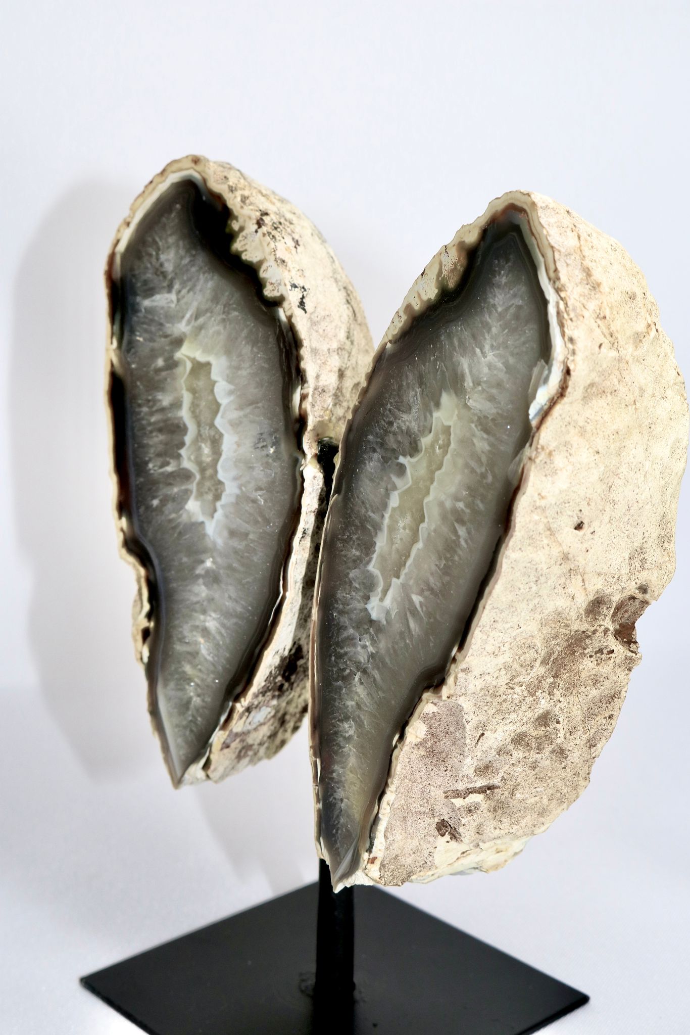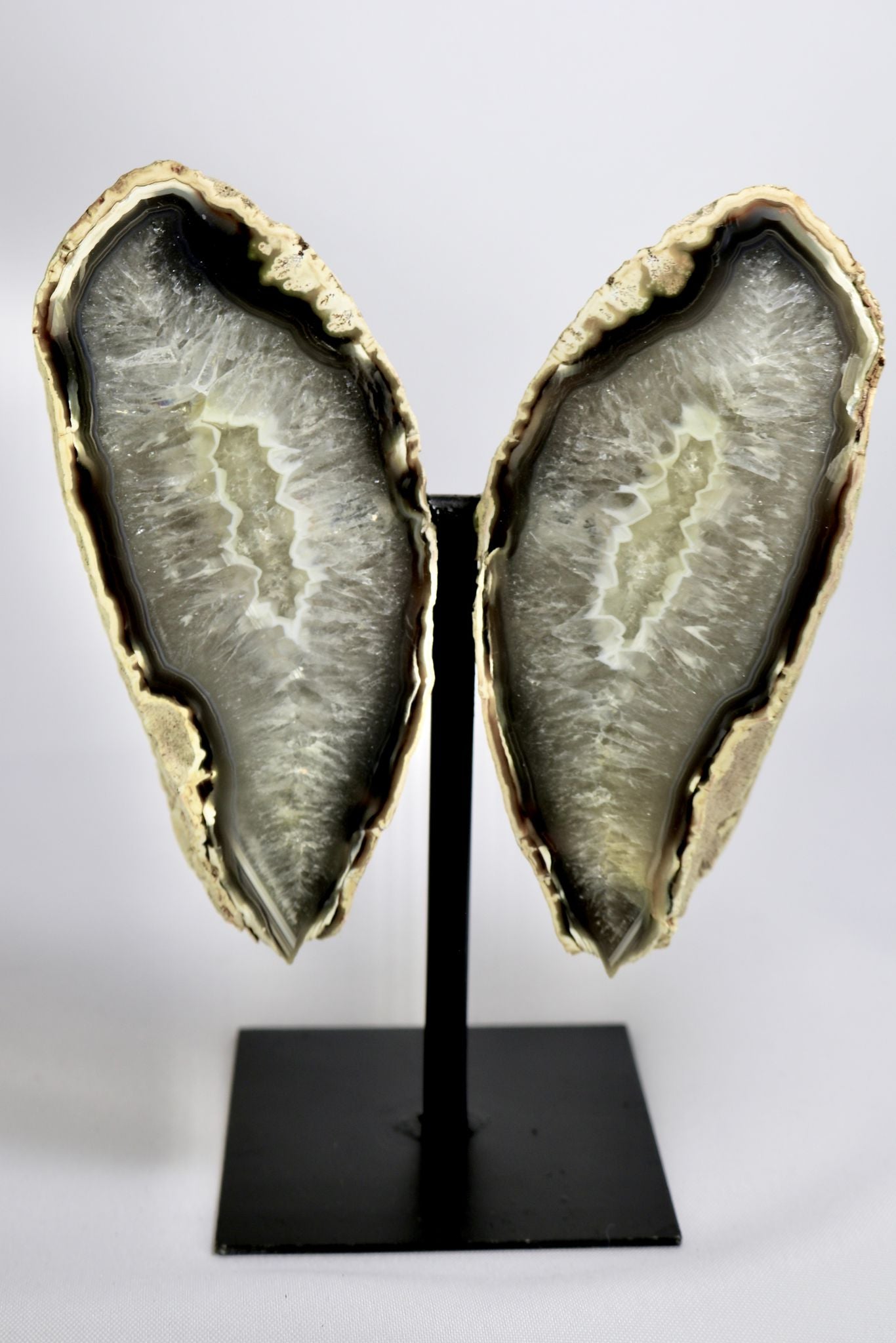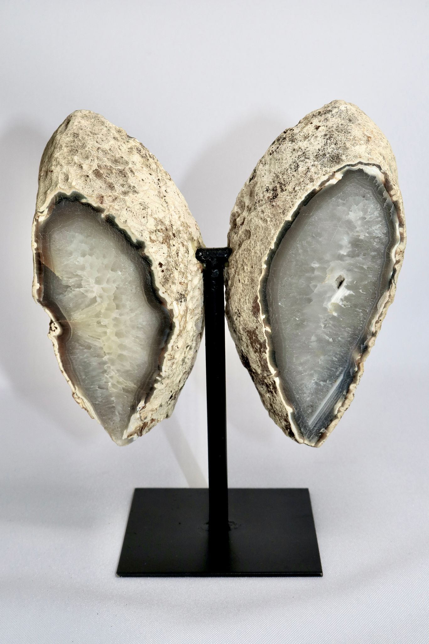 Dieser Achat-Schmetterling auf schwarzem Stand besticht durch seine natürliche Farbgebung und die feinen Bänderungen des Steins. Das kunstvolle Design macht ihn zu einem dekorativen Blickfang für jeden Raum oder Schreibtisch.