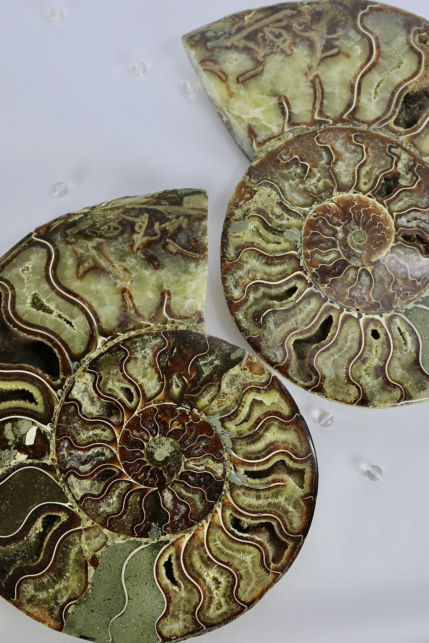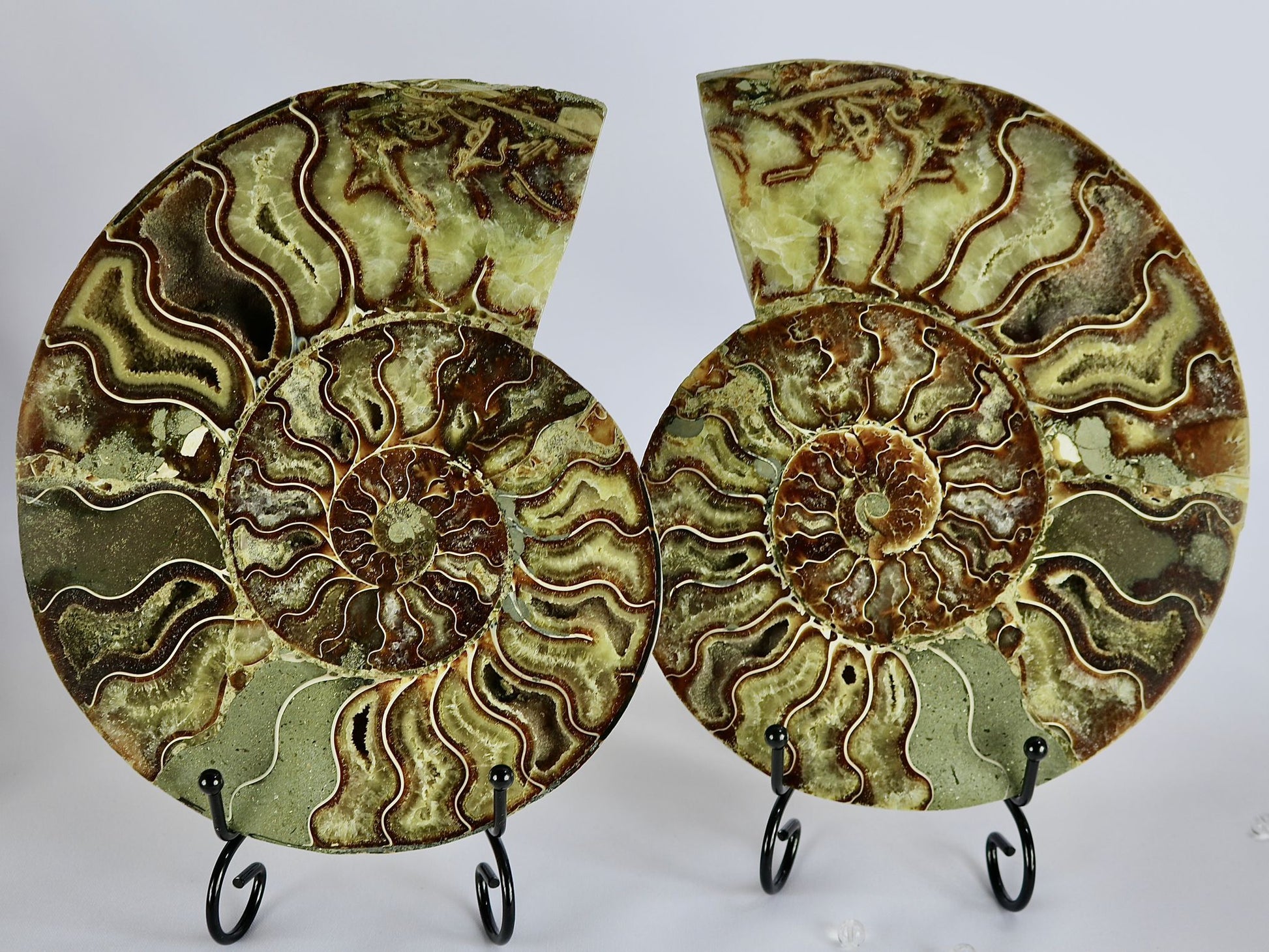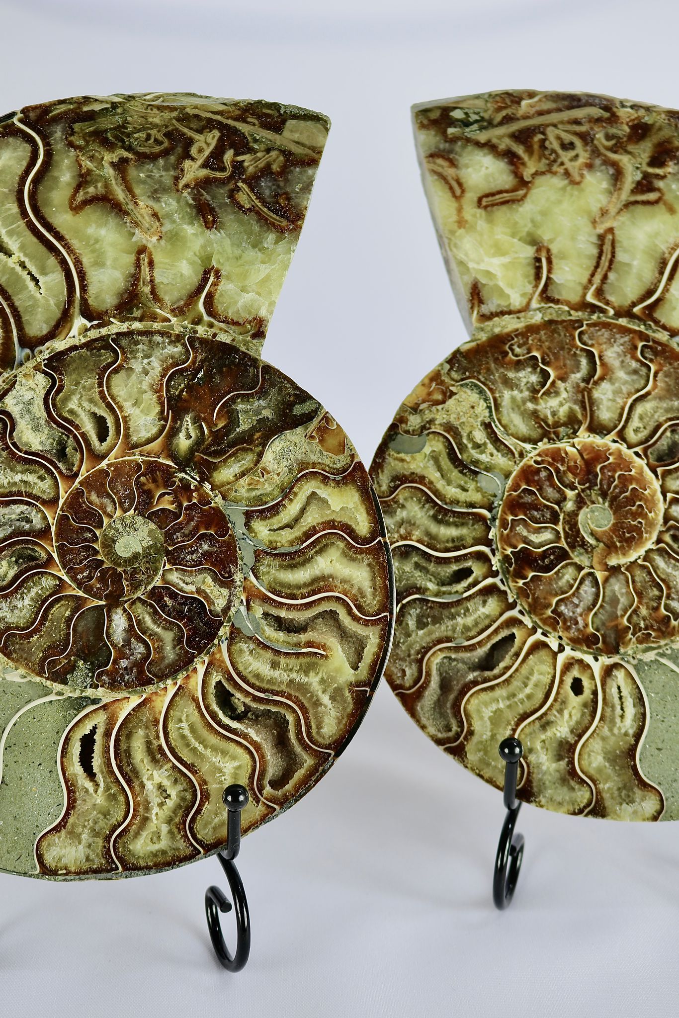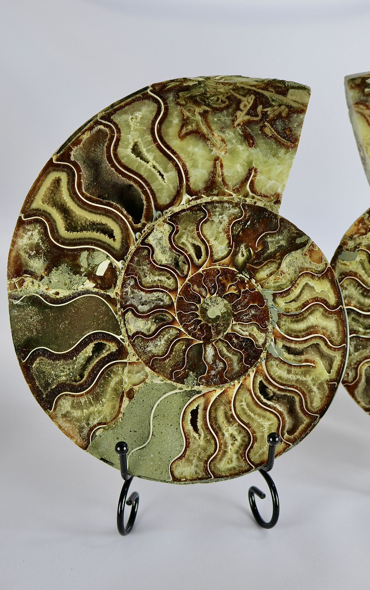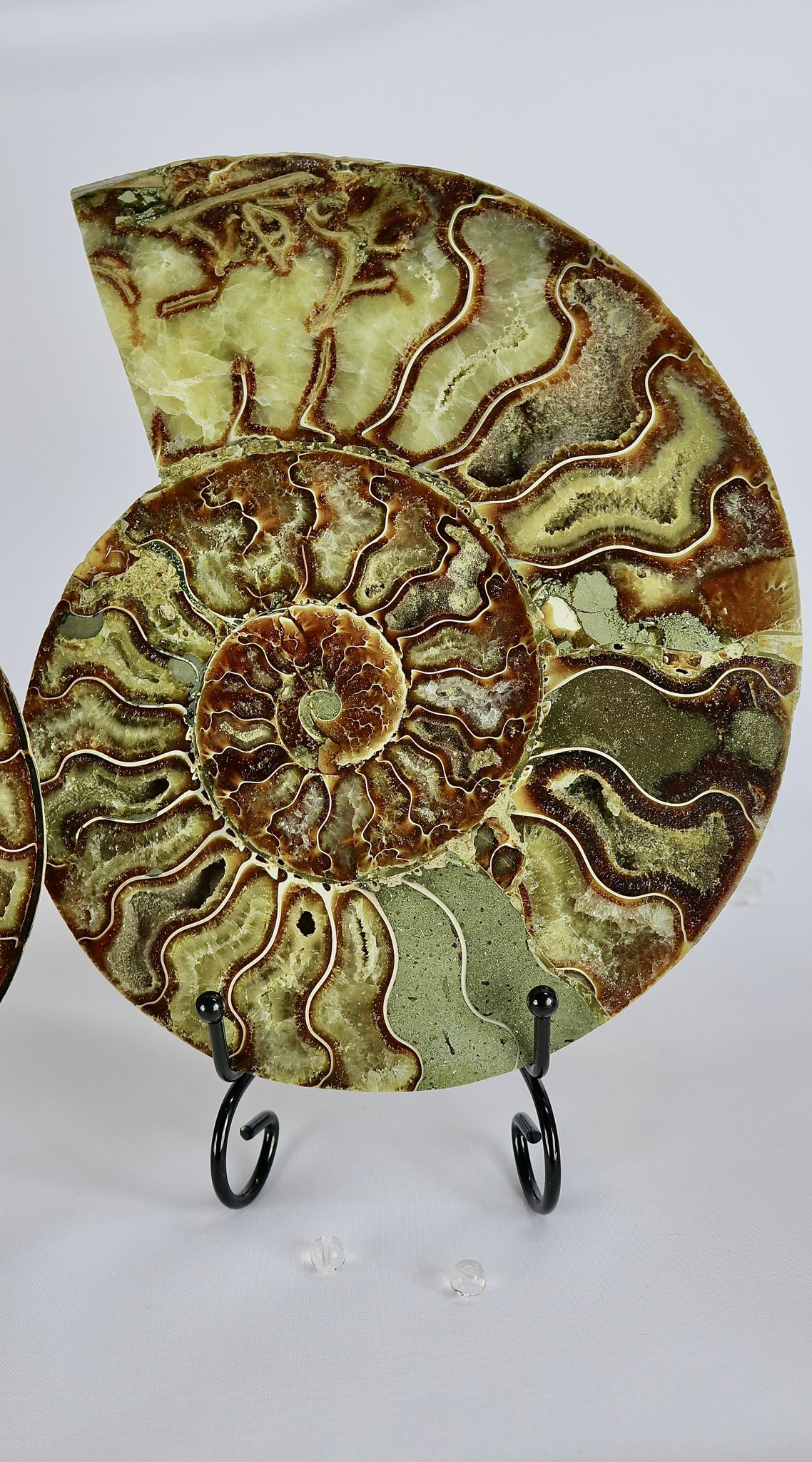 Wichtig: Es handelt sich um zwei Hälften, die zusammen einen Ammoniten bilden. Kommen mit den schwarzen Halterungen.