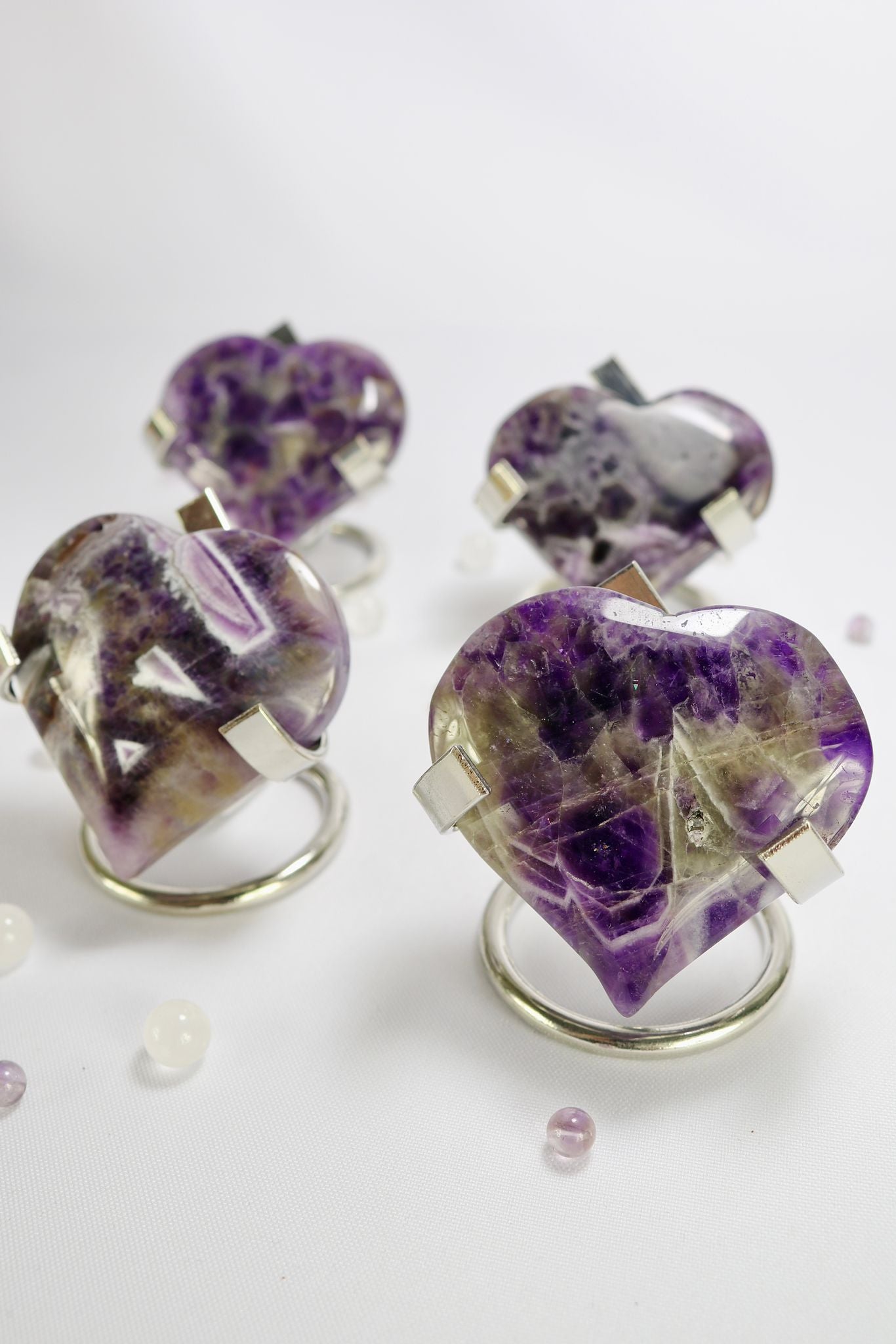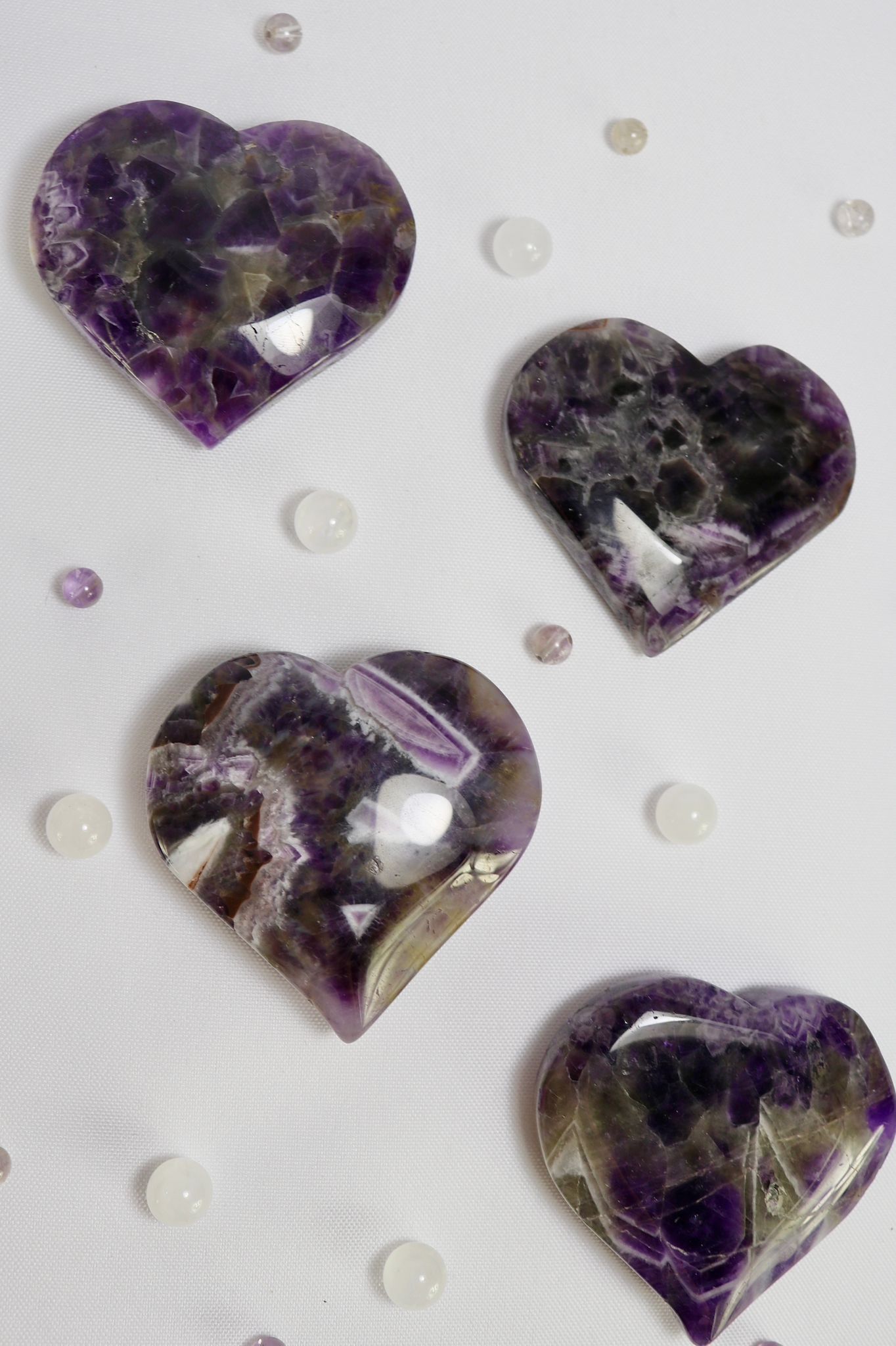 Die Chevronamethyst-Herzen überzeugen durch ihre charakteristischen Bänderungen und die kräftigen Violetttöne. Sie eignen sich ideal als dekoratives Element, Sammlerstück oder kleines Geschenk.