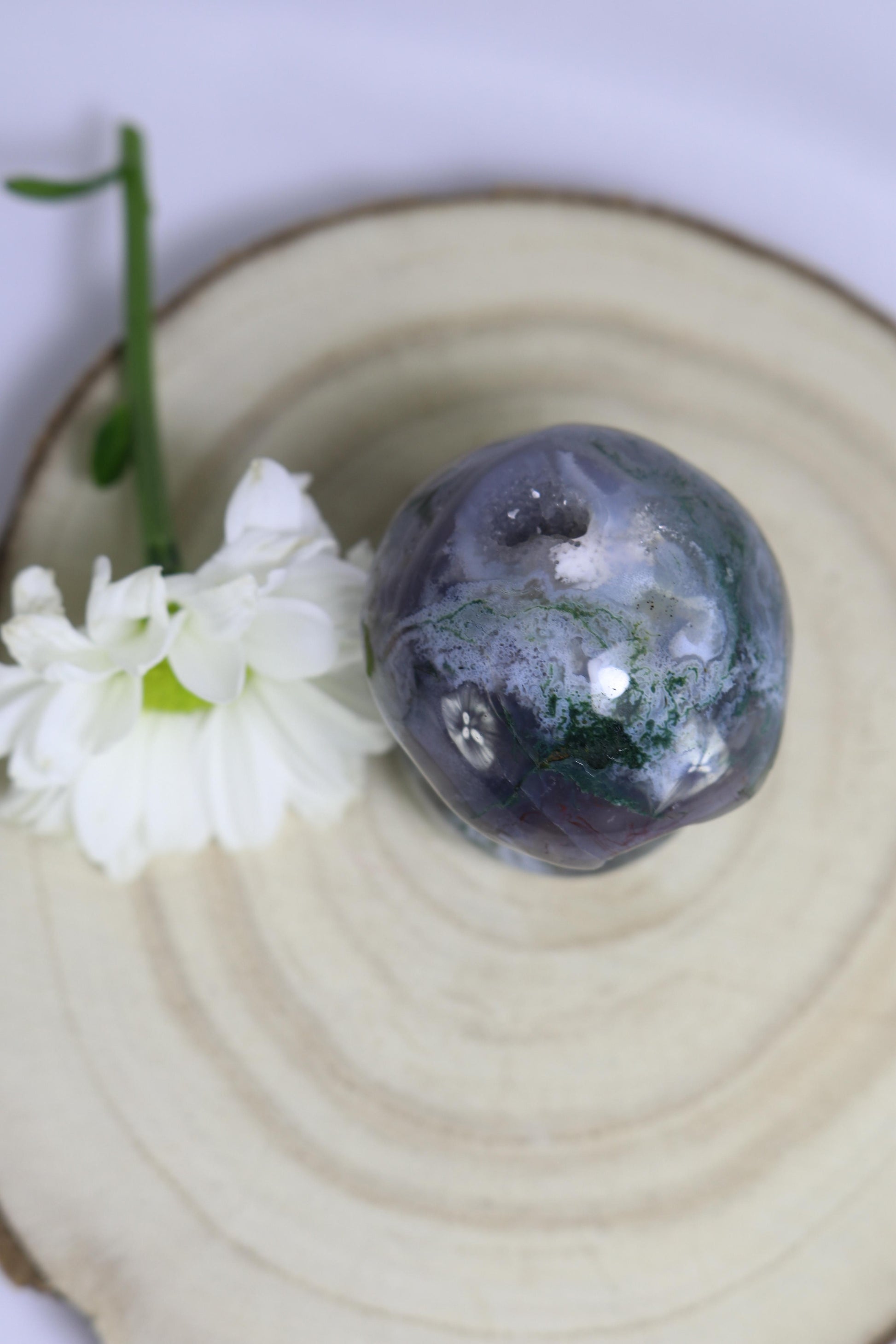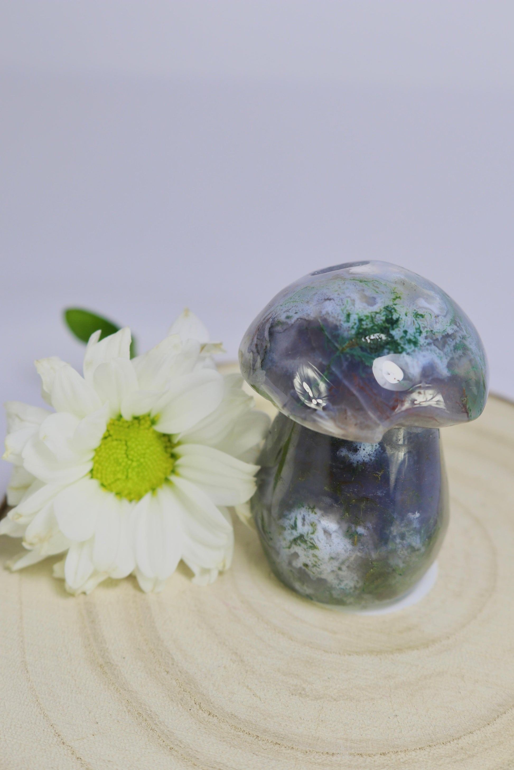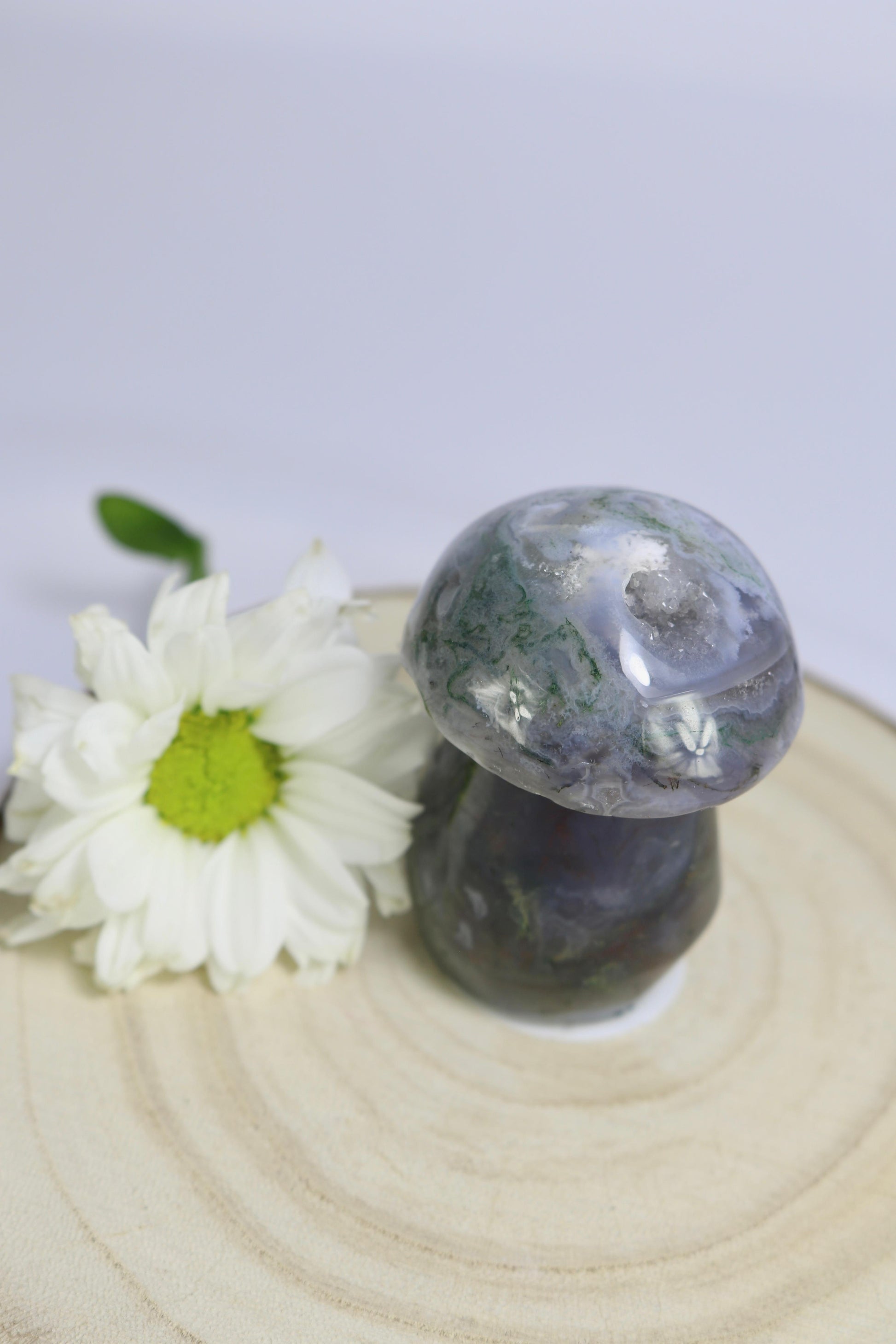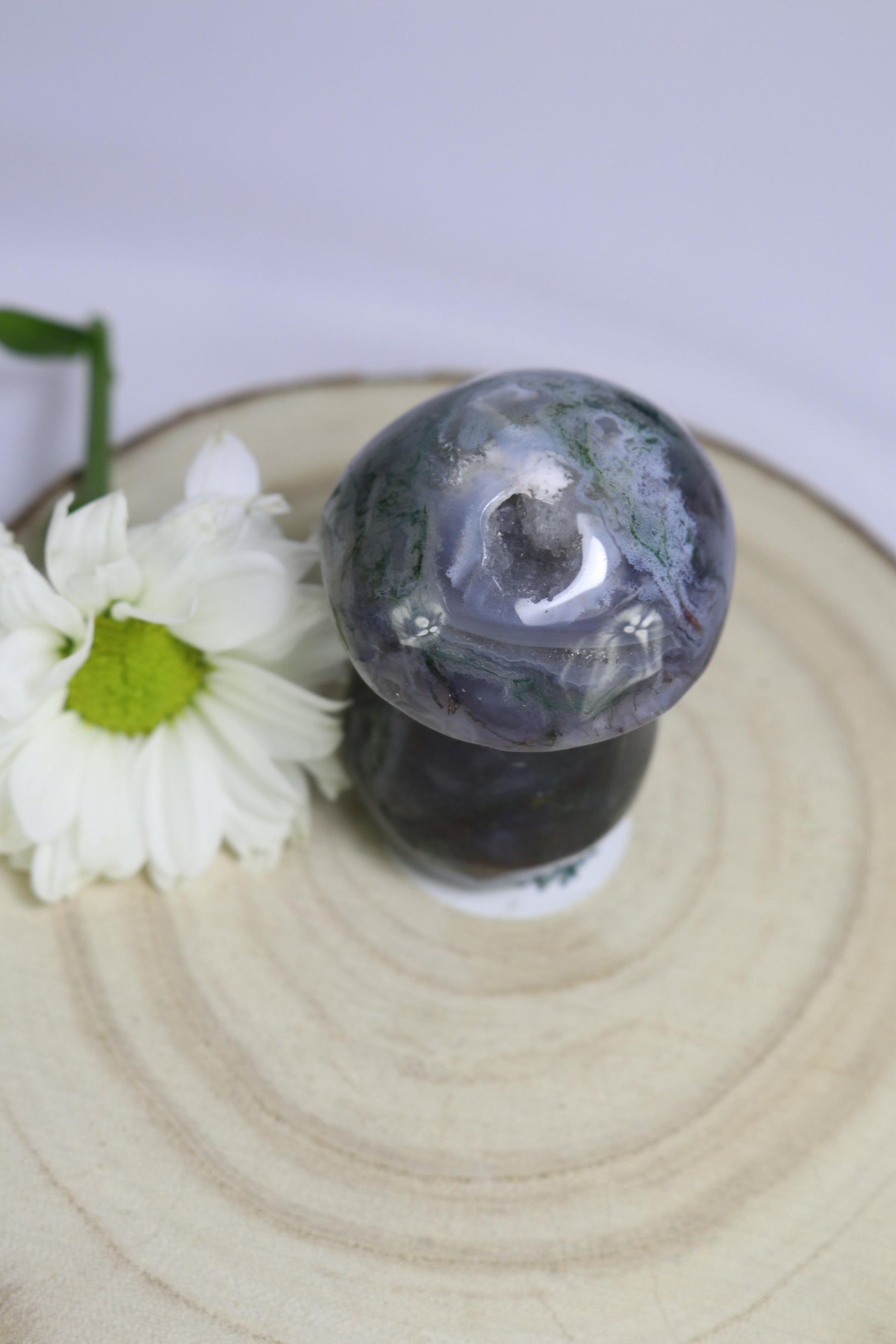 Der Moosachat-Pilz besticht durch seine natürlichen Grüntöne und feinen Musterungen des Steins. Jedes Stück ist handgearbeitet und eignet sich ideal als dekoratives Element, Sammlerstück oder kleines Geschenk.