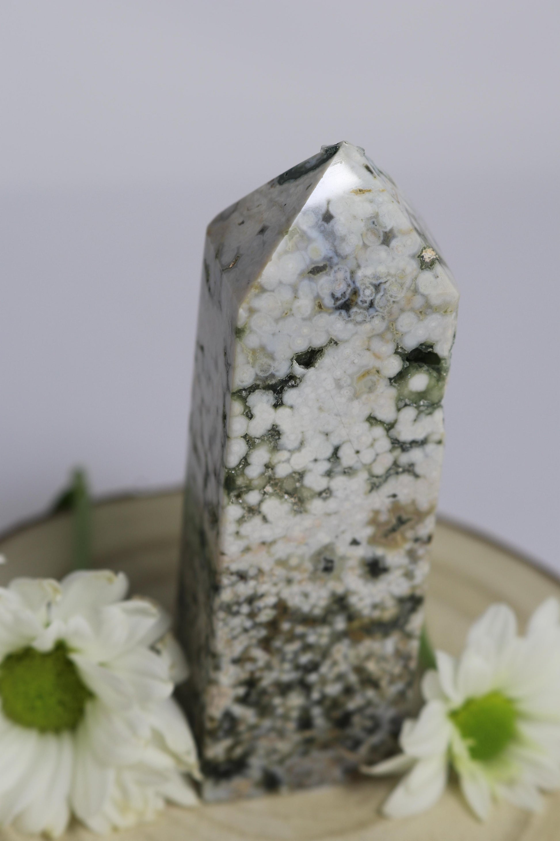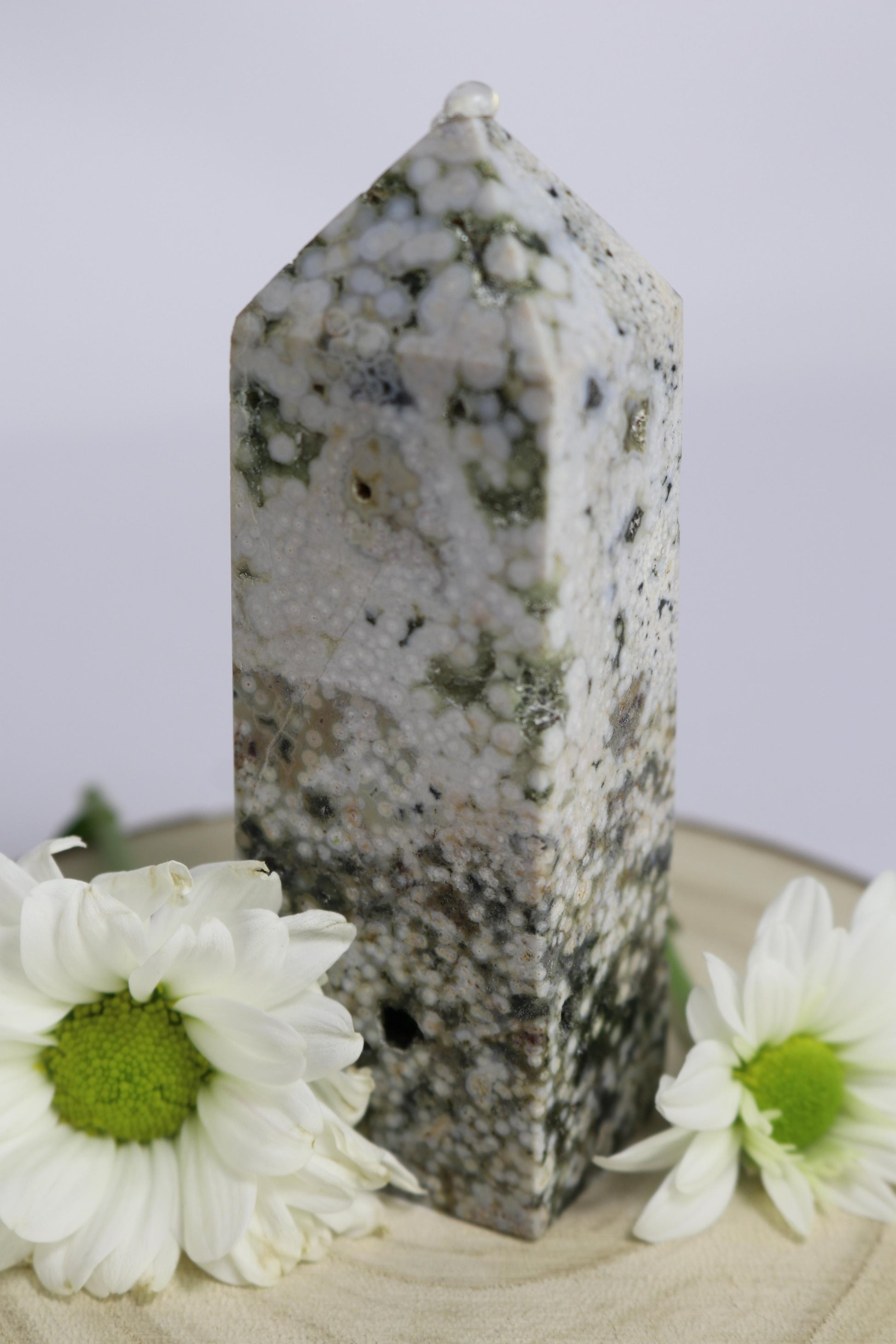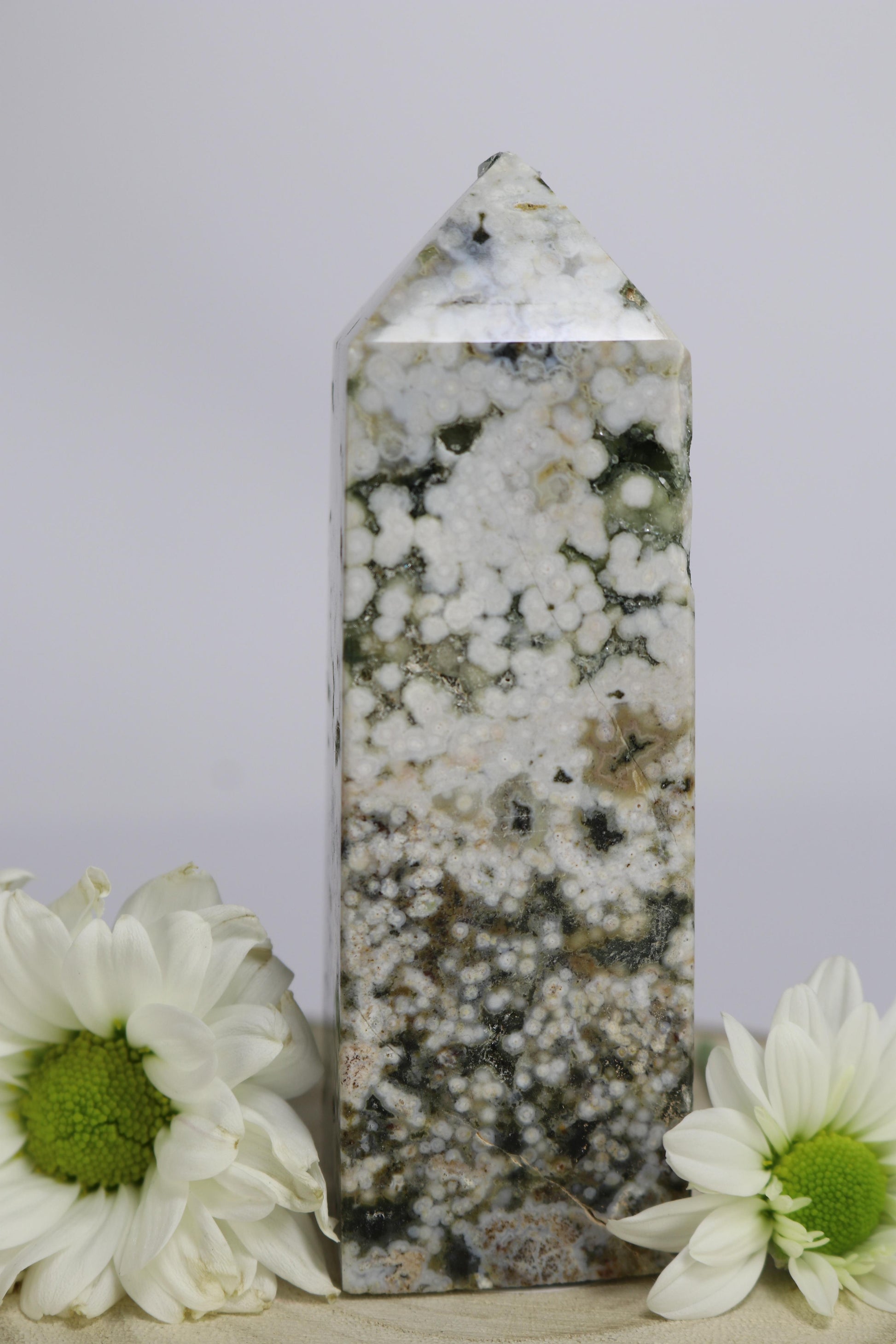 Der Ozean-Jaspis-Turm besticht durch seine einzigartigen Muster und die natürlichen Farbverläufe des Steins. Er eignet sich ideal als dekoratives Element, Sammlerstück oder Blickfang in jedem Raum.