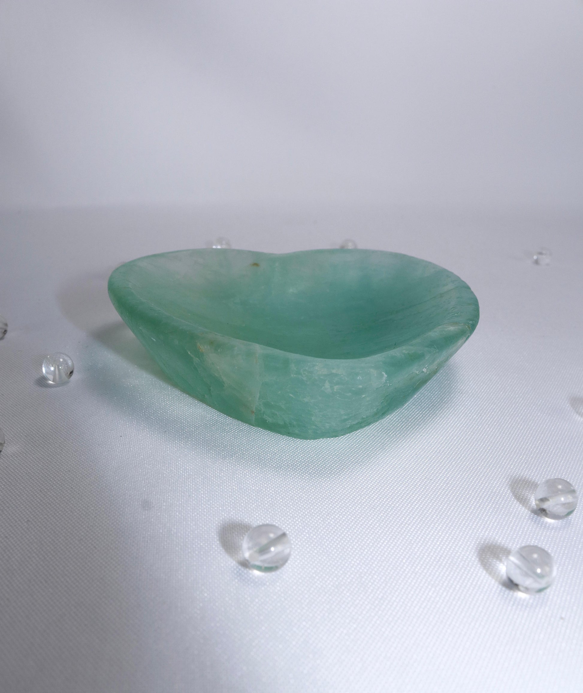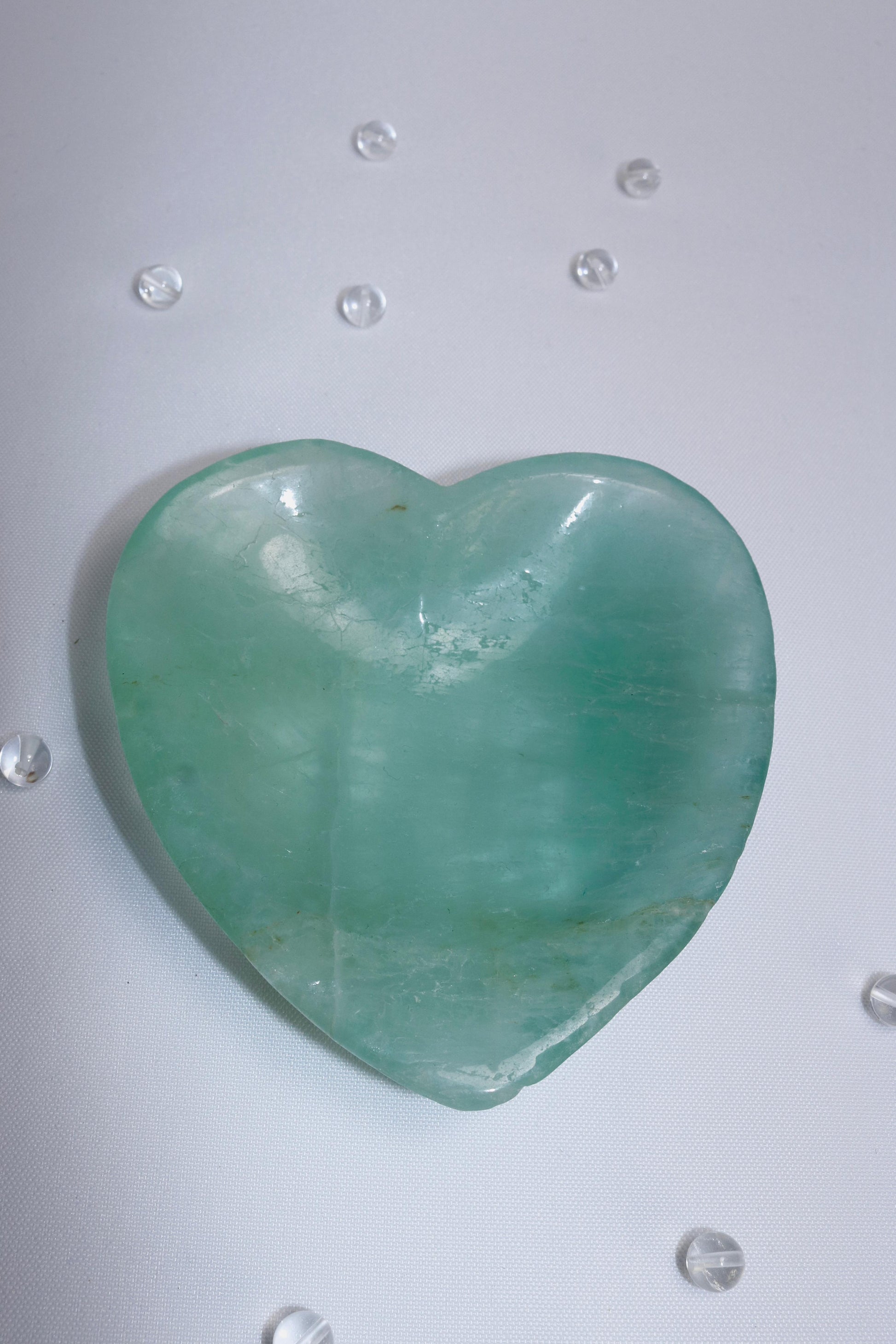 Die herzförmige Schale aus Fluorit besticht durch ihre sanften Farbverläufe und die natürliche Transparenz des Steins. Sie eignet sich ideal als dekoratives Element, kleine Aufbewahrungslösung oder Geschenkstück.