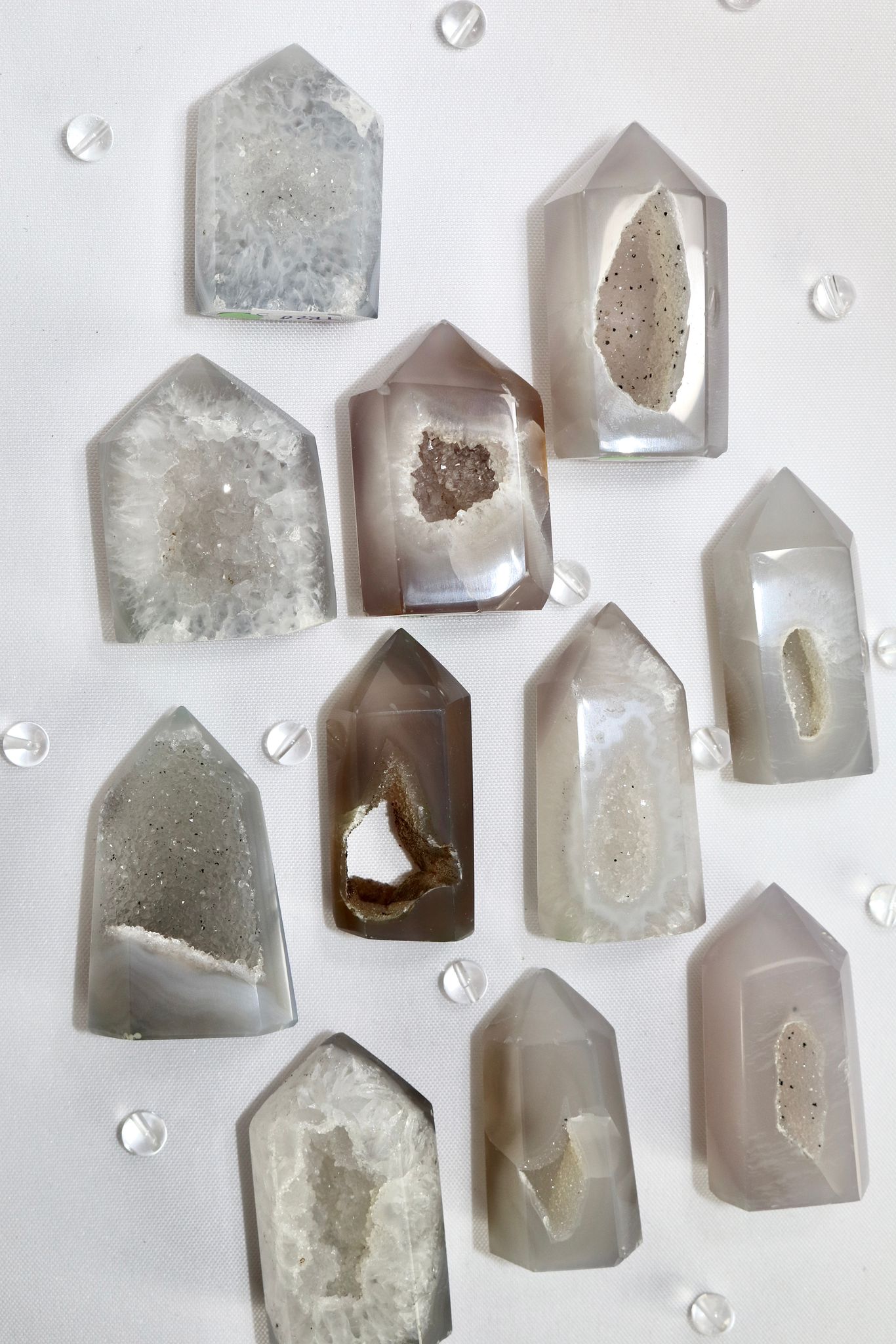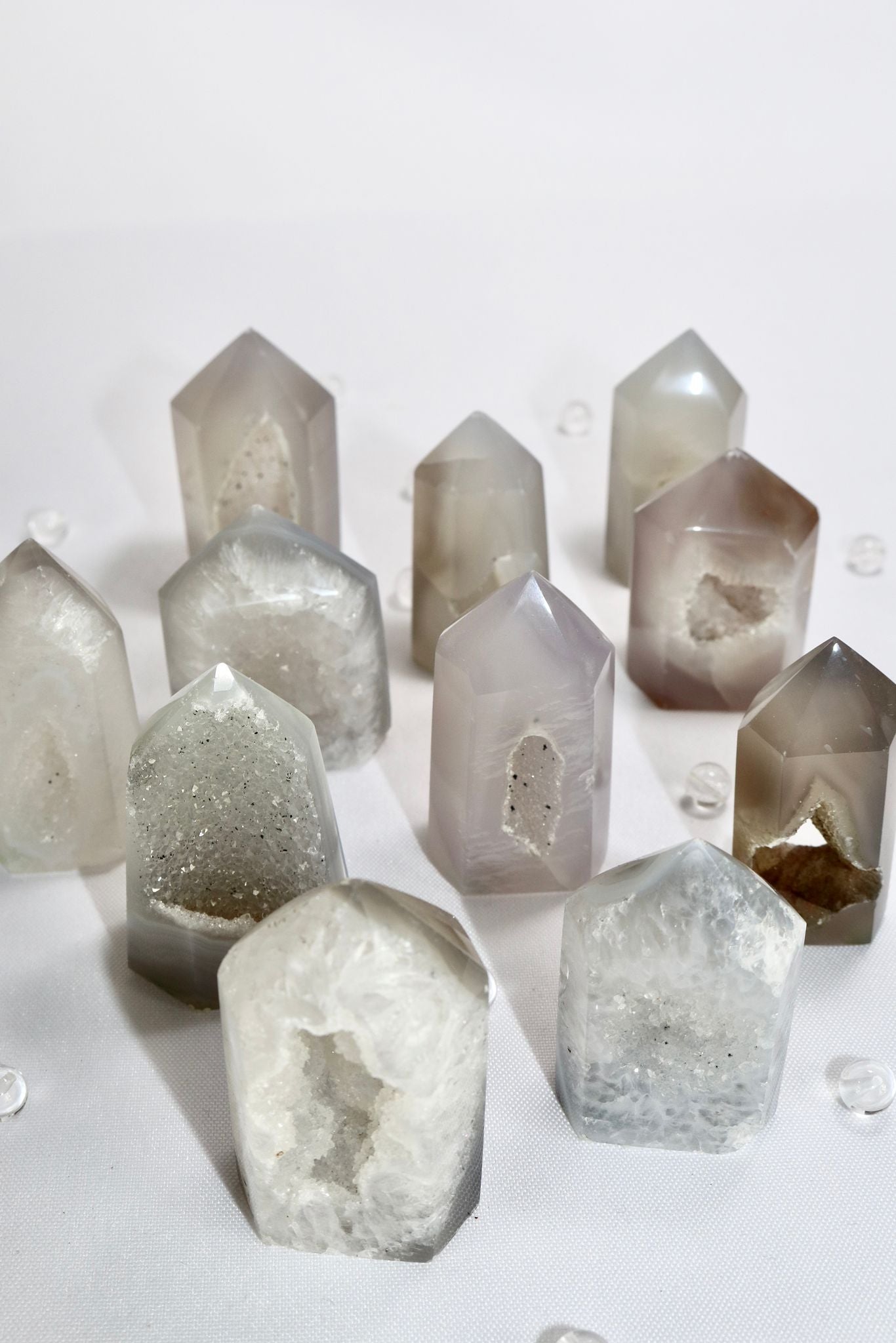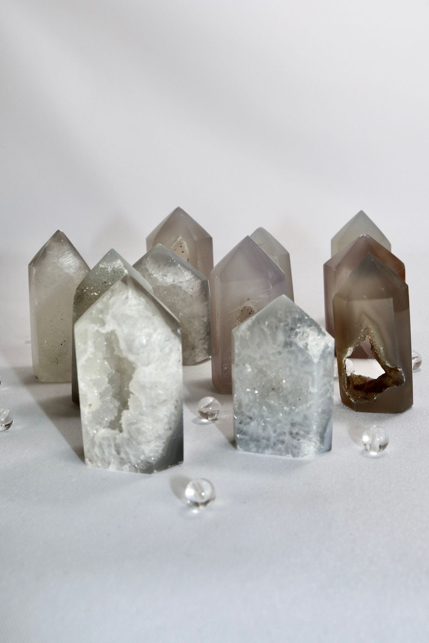 Die Achat-Türme zeichnen sich durch ihre charakteristischen Bänderungen und abwechslungsreichen Farbtöne aus. Sie eignen sich hervorragend als dekoratives Element und bringen natürliche Eleganz in jeden Raum.