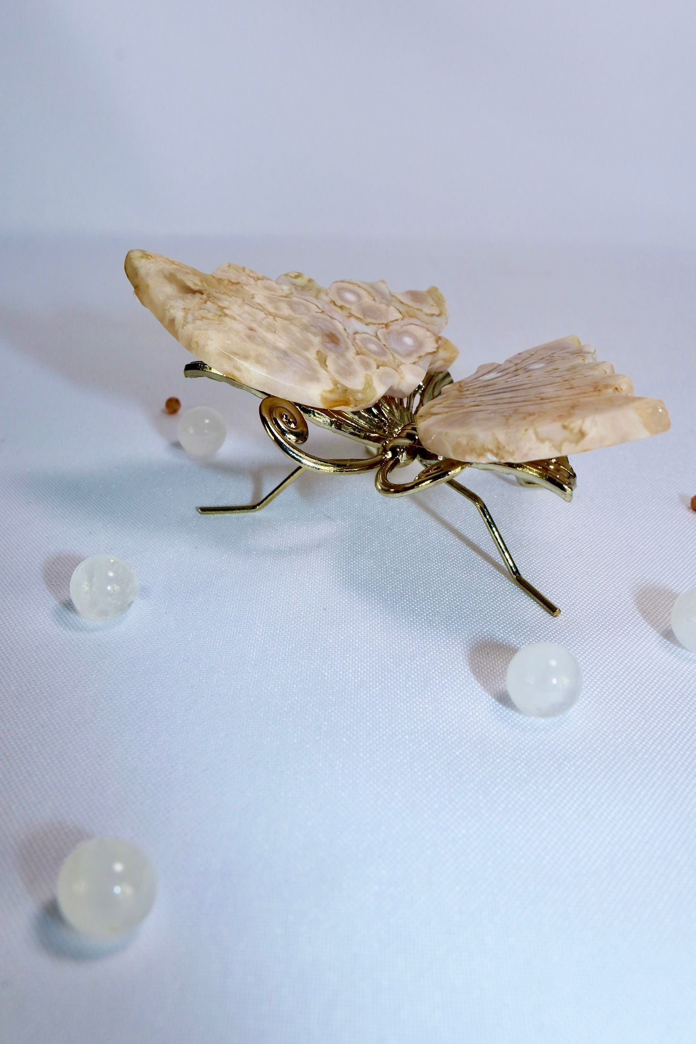 Der Blumenachat-Schmetterling besticht durch seine natürlichen Muster und vielfältigen Farbtöne. Jeder Schmetterling ist handgearbeitet und eignet sich hervorragend als dekoratives Element oder kleines Sammlerstück.
